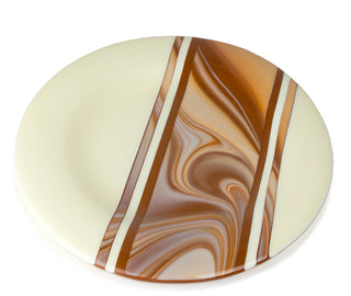 Choosing colors to use with a Fusers Reserve is a big part of the fun in working with the line but sometimes it can be a difficult to choose just what will bring out the very best in the glass. We try to study the glass and let it “talk to us” as much as possible. In the example here, the rich color in the swirls reminded us of sweet caramel, so pairing it with buttery Vanilla Cream was the perfect recipe.